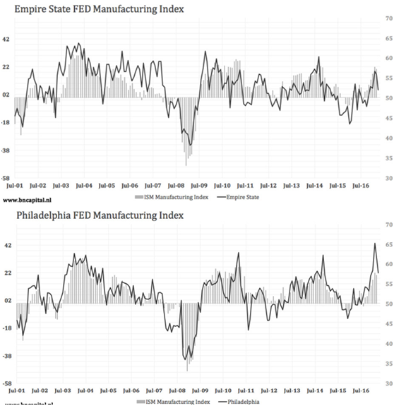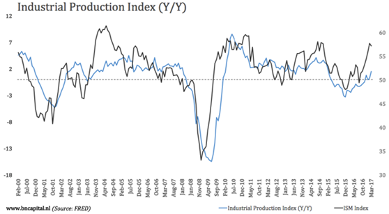 从美国最好的领先指标,ISM制造业指数来看,通过与标普500指数进行叠加对比,可以看出二者呈现明显的关联性。自2014年触顶回落之后,经历2016年以来的反弹,与标普500指数的走向拟合度较高,因此,在ISM制造业指数持续向好的同时,排除短期内特朗普政策的影响,股指有望进一步重回上涨趋势。