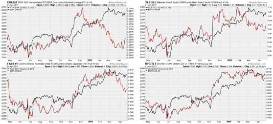 上方四图红线分别为:交运板块与道指叠加,原材料和公共事业板块叠加,澳元和日元资产,高收益债券与政府债券叠加。