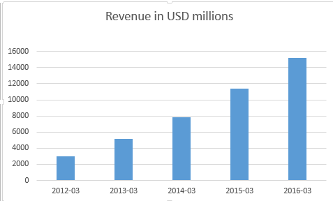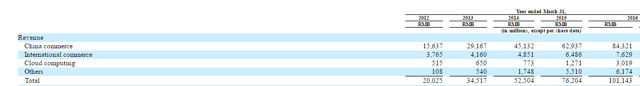 从上图表可以看出,阿里巴巴过去5年营收增长强劲。鉴于公司已经显示出它在扩张营收方面的能力,笔者认为未来此趋势将会持续。与此同时,尽管过去5年阿里巴巴的平均增速高达53%,笔者依然认为2017年其增速将会更快。接下来为了更好地分析阿里巴巴的增速从何而来及公司的业务部门对公司未来增长有何影响,笔者将简要分析阿里巴巴的各业务部门。
