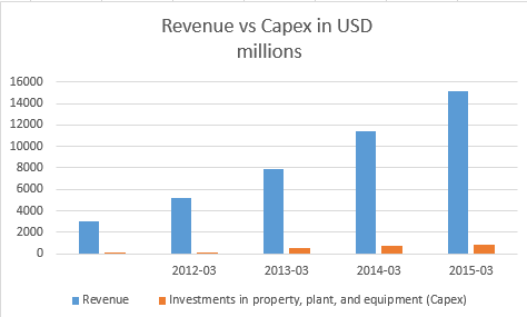 与此同时,阿里巴巴持有24亿美元现金,笔者认为这也显示了公司有非常大的投资潜力。此外,从历史数据来看,阿里巴巴的资本支出往往都能创造高额的营收,这从下图便可看出: