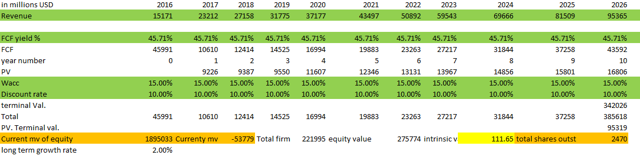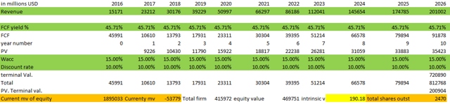 阿里巴巴当前的股价在111美元左右。假定将公司的加权平均资本(WACC)设定为15%,2017年至2026年的自由现金流营收占比为45.71%,同时2017年的增长率为53%,从此计算出市场对阿里巴巴2017年至2026年的营收增速预期为17%。具体计算请看下图: