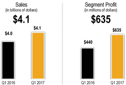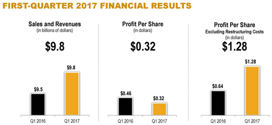 卡特彼勒公司CAT公布2017年第一季度财报,通过适当的价格策略,控制好产品成本,大力推广市场喜爱的小型化机械,凭借全球大兴基建的东风,公司业绩在第一季度顺利增长。数据显示,公司第一季度营收达到98亿美元,超过华尔街预计的92.71亿美元;扣除重组成本EPS录得1.28美元,远高于市场普遍预计的62美分。