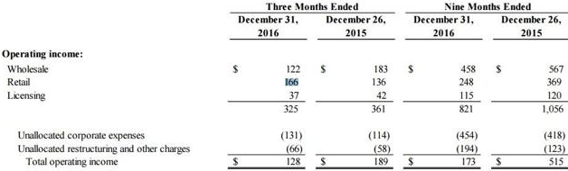 公司的重组将导致4亿美元的费用开支。重组费用包括约3亿美元的现金相关开支和约1亿美元的非现金开支。拉尔夫劳伦预计减少库存会导致额外多达1.5亿美元的非现金开支。迄今为止,公司2017财年前三个季度开支为9100万美元,这意味着公司还将在第四季度进行大量重组活动。此外,4月4日,公司宣布继续投入3.7亿美元用于新一轮重组。