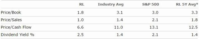 上表显示了拉尔夫劳伦的部分估值指标,从中可以看出公司的几项估值指标都较低,这意味着市场并不看好公司管理层能成功带领公司实现逆转。