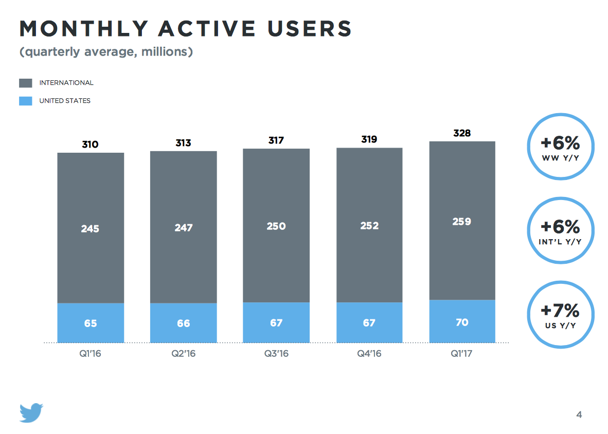 第一季度,推特的月活跃用户增长900万至3.28亿,而前三个季度月活跃用户才仅增加了900万,其中2016年第四季度表现最差,尽管推出了NFL赛事转播,月活还是增长最少。