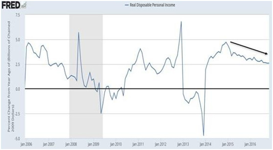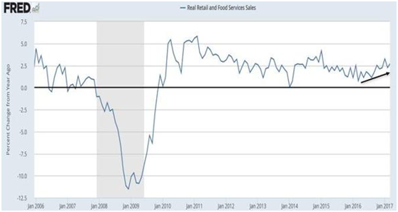 而且经济的推动是需要消费者真正花钱消费才能拉动的,从下图可以看出,虽然零售消费没有金融危机后增长的那么强劲,但是自2011年回落后,在2016年期间,开始有所反弹,作为经济的领先指标,具有很高的价值。