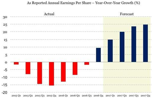 最后,落实到企业利润上来看,目前,企业利润仍在长达两年的衰退当中。从2014年油价开始下跌,企业当年三季度利润涨幅达到峰值,在2016年已经连续7个季度下滑。但是随着制造业周期性回暖,2017年企业利润增速开始恢复,这对美国整体经济来说是至关重要的。而且,从近期上市公司所发的一季报来看,企业利润增速回暖已经成立。