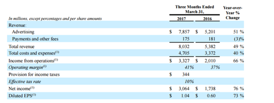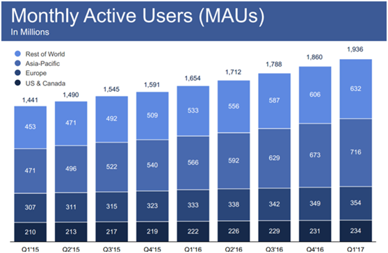 FB在2017年首季取得良好开端,营收80亿,超过预期的78亿美元;GAAP EPS 1.04美元,超过华尔街预期的0.87美元。用户数从去年四季度的18.6亿上涨到19.4亿,增速较上季度加快。