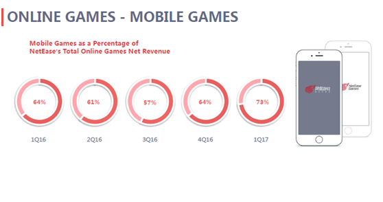 游戏业务仍然是网易财报中最大的亮点,第一次突破百亿元大关,主要得益于几款重磅游戏的成功,比如《阴阳师》,《倩女幽魂》,《镇魔曲》等手游,在线游戏中,手游的比重在逐渐加大。