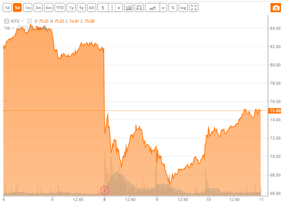 KITE由于之前临床试验出现死亡事件,公司股价一天内下跌了13%,公司解释说,死亡患者由于对一次和二次治疗出现不良反应,导致脑水肿,多处器官衰竭,这是公司总共200例患者中的第一次遇见上述情况。
