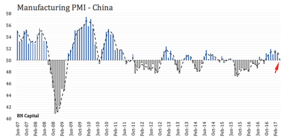 而公司股价在2016年的反弹,很大程度上得益于中国的基建政策,而扩张政策也使中国经济杠杆上升,中国人民银行贷款在去年上升了243%。因此,中国在近期开始进行了降杠杆,其力度可谓是史无前例。目前,最近两个月,已经让中国人民银行贷款降低了12%,而且,A股和大宗商品以及楼市都呈现出不同程度的降温。