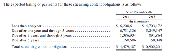 在过去四年间,公司烧了大量的钱在内容上。过去四年公司营收累计超过250亿美元,几乎花费了一半在内容上。截止2016年底,公司流媒体内容或有债务大约在145亿美元左右(其中计入资产负债表的有65亿,大约80亿尚未计入表内),加上其他债务,总的或有债务大约为200亿美元。
