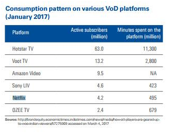 而这些互联网玩家之外还有来自有线电视,或者说卫星转播的竞争,收费从3美元到12.3美元不等,覆盖新闻,体育,电影,动画,教育,生活等各类内容,甚至是手机APP上的内容。印度也是电影生产大户,一年产生2000部影片左右,差不多相当于每天5部以上多种语言影片,内容已经足够丰富了。