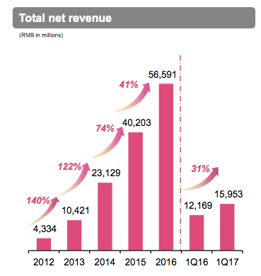唯品会过去都保持在三位数的增长以上,后来不断下降,到2017年一季度,同比增长降到31%。