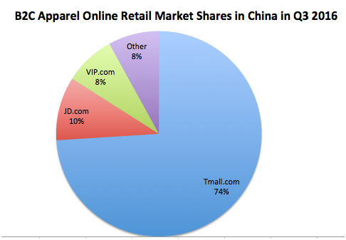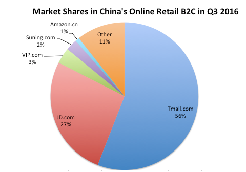 根据Analysys去年3季度的数据,中国的B2C电商市场,天猫占据首位,份额约56%,之后是京东,唯品会,市占分别为26.6%和3.5%,竞争格局相对稳定。