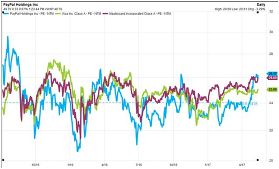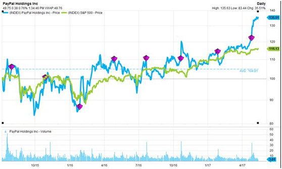 Paypal 4月底发布了强势的一季度财报,股价也一路上涨,事实上,从eBay分拆出来以后,Paypal的表现就一直是跑赢大盘的。然而,这个股票争议很大,投资者担心来自更多重量级对手的竞争,比如苹果,亚马逊等。因此,即使公司能够不断的发布好业绩,股价表现依然很脆弱。