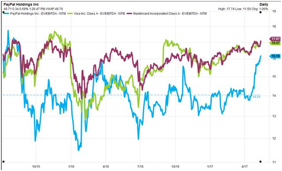 公司最直接的对手应该是Visa和万事达,如下面两幅图所示,无论是看PE还是市值与EBITDA比率,Paypal都比其他两个公司弱势。近期,公司终于缩小了与两个对手的差距。