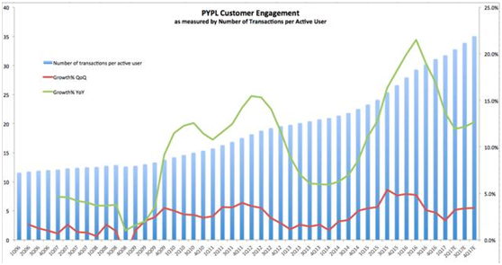 Pypl以前只是eBay后面的一个支付按钮,独立以后,支付场景逐渐扩宽了,用户的使用率也逐渐上升。