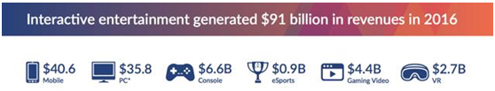 在2016年游戏总共910亿美元的规模中手机游戏就占据了406亿美元的份额,这就是为什么现在手机和移动端游才是电子游戏的最大市场。