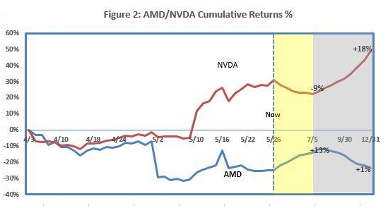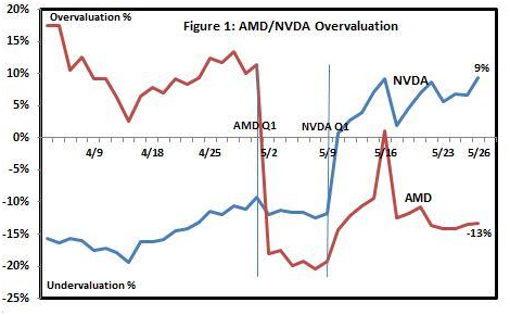 可以看出,目前AMD被低估了13%,而英伟达则高估了9%,这种估值模型也可以由过去的股价变化得到检验。