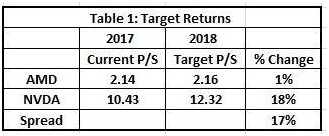 我们也可以采用预测P/S来间接对股票估值,但是用的是2018年的营收增长和盈利水平预测数据。在最有可能的情况下,AMD 明年的P/S比为2.16,英伟达为12.32,而目前该数据分别为2.14和10.43,说明AMD将至少上涨1%,而英伟达有18%的上升空间。 这只是根据营收预计估算出来的,实际回报还将取决于明年的实际营收情况。