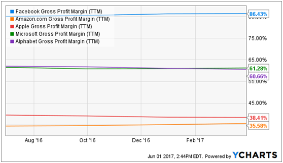 通过对业务的分析,市场地位的评判,这些因素就造就五巨头不同的利润状况。下图为五家公司的毛利率情况,可以明显地看出Facebook拥有绝对的优势,而亚马逊则排在最后。通过五家公司的排名可以得出,前三名的Facebook、Google和微软主要是软件公司,而亚马逊和苹果则以硬件为主。