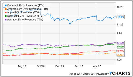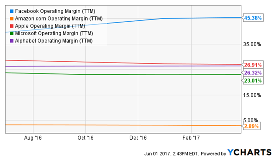 在估值方面,由于Facebook快速崛起,通过公司价值与收入乘数对比,Facebook以13.43倍处于最高位,但是已经从去年开始下滑,其他四家公司基本维持在3-6倍的水平。值得注意的是被诟病为估值过高的亚马逊,在这里则排名最后一位。