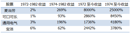 但是,其背后的投资逻辑是正确的,在接下来的45年里,公司都是复合性增长,但是如果在高点介入的话,还是需要至少10年来填补调整所带来的损失。在“漂亮50”里面筛选麦当劳、可口可乐 、通用电气和宝洁,通过下表可以看出,如果从1972年买入持有10年,经历74年的调整,收益仅只有个位数;但是从市场调整过后买入,持有到1982年收益就是至少50%;而从1972火爆之时持有到现在,收益也是超过10倍;但是相比于调整过后买入的利润显然,一个在天上,一个在地上。