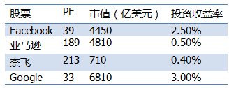“FANG”股票很可能与上述“漂亮50”相类似:首先,公司的市盈率都很高,抛开亚马逊和奈飞这种特殊情况,接近40倍市盈率的Facebook,在拥有接近4500亿美元的市值下,可以看出市场给了相当大的溢价;而且股票的收益率相对于美国国债收益也没有很大的吸引力。