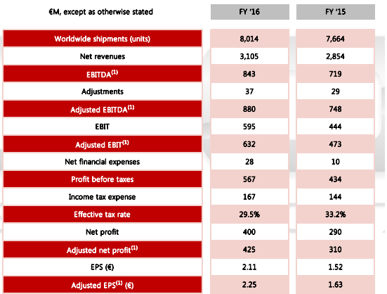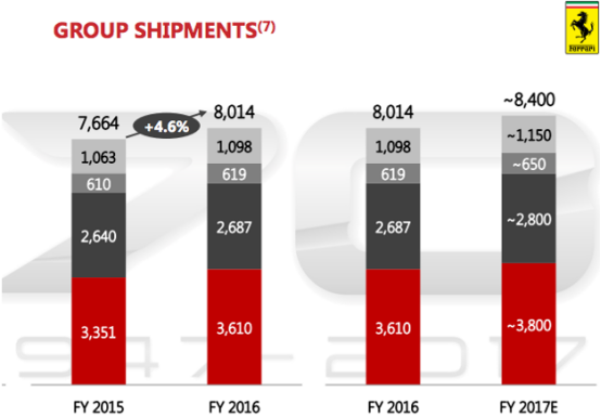 如下图所示,法拉利的净营收从2015财年的28亿欧元增至2016财年的31亿欧元,同比增长9%。公司预计2017财年净营收将突破33亿欧元。法拉利全球交付数量从2015财年的7664辆增至2016财年的8014辆,这表明海外需求有所上升。净利润从2.9亿欧元增至4亿欧元,公司每股收益从1.52欧元增至2.11欧元。