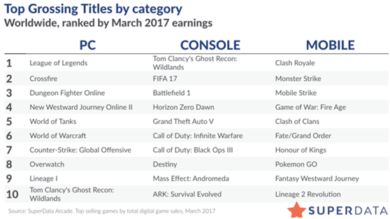 根据SuperData统计,2016年《守望先锋》狂揽5.85亿美元高居榜首,超过排名第二至第五四款游戏的年收入之和,占据规模达54亿美元付费PC游戏市场的10%以上。而且,《守望先锋》还是动视暴雪再取消RPG类《泰坦》后出品的首款第一人称射击MOBA类游戏,因此,该作品也是SuperData2016年榜单中,上市时间最短和最快登上榜首的游戏,可谓是称霸全球。