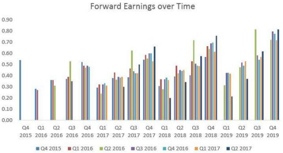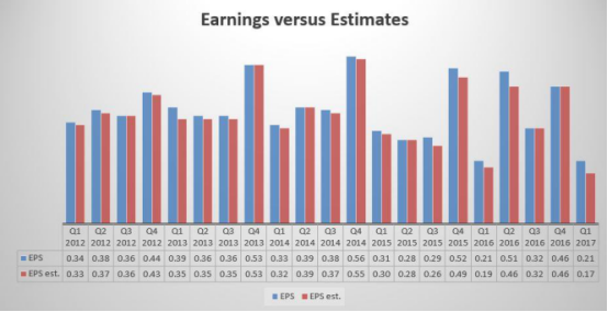 过去21个季度中,通用的业绩表现都是达预期或超预期的。尽管利润没有什么增长,但公司营收已连续四个季度实现增长。虽然分析师之前几个季度对通用的业绩预期不高,但他们对公司未来三年的利润增速预期分别为9%、14%和7%。