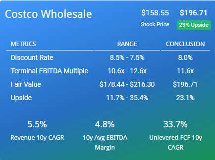 预计好市多未来还有20%以上的上行空间。过去十年中,好市多营收的复合年均增长率为5.5%,EBITDA利润率的平均增速为4.8%,无杠杆自由现金流的复合年均增长率高达33.7%。如下图所示,根据上述数据算出好市多的公允价值目标价为196.71美元,比当前股价高出20%以上。