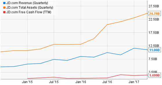 京东今年一季度收入达到110.6亿美元,同比增长41.2%;在过去的一年中,公司经营现金流和自由现金流分别同比增长了450%和120%,总资产也在不断增长,一切都在表明公司正在快速发展。