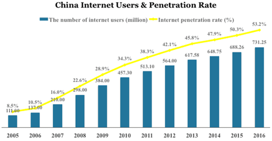中国的电子商务市场仍处于起步阶段,接下来将会稳步增长,随着中国中产阶级的扩大,未来会有更多的互联网用户。