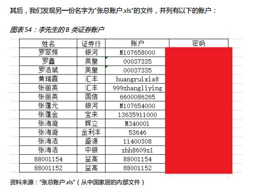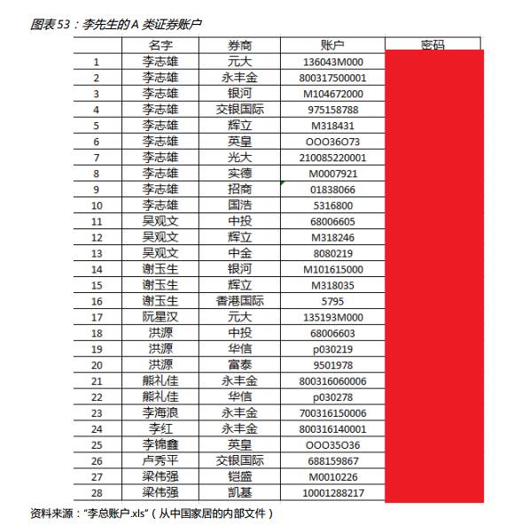 而更精彩的是报告详细例明这90多个帐户的名字、帐户号码、所在券商及密码! 当然以保密为由,对于密码都加以隐藏。