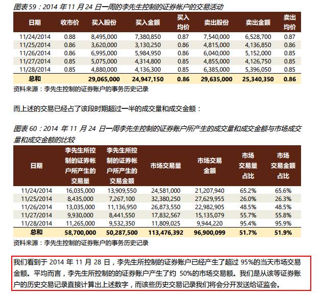 “我们看到于 2014 年 11 月 28 日,李先生所控制的证券账户已经产生了超过 95%的当天市场交易金额。