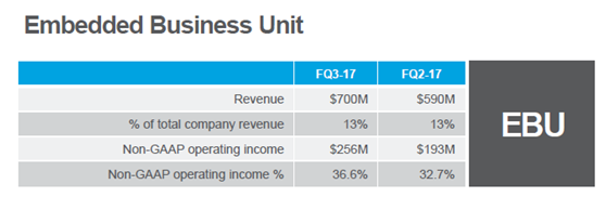 嵌入式业务:营收7亿美元,环比增长19%,占总营收的13%,运营利润率37%,环比上升4个百分点;主要受益于DRAM涨价,工业用DRAM和应用于自动驾驶的eMMC NAND出货创纪录。