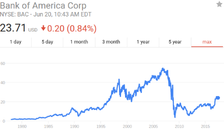 从长期来看,美国银行股价会有不错表现。2006年美国银行股价的新高在55美元左右,这表明当前2007年到2009年间公司股价回调了不到50%。