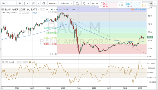 根据斐波那契数列回撤理论,如果股价回调61.8%,那么当前股价应为35.05,比当前股价高出约47%。因此可以看出,美国银行的上涨空间比较大。