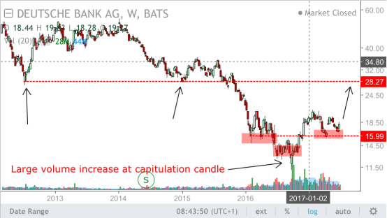 2017年德银股价就出现了这种情况,投资者对德银的财务状况是否足以支撑股价心存忧虑,文章开头提到的公司基本面情况反映在股价中。公司股价跌至16美元,同时交易量也在增加,从股票走势来看,头肩反转,并且出现右肩。