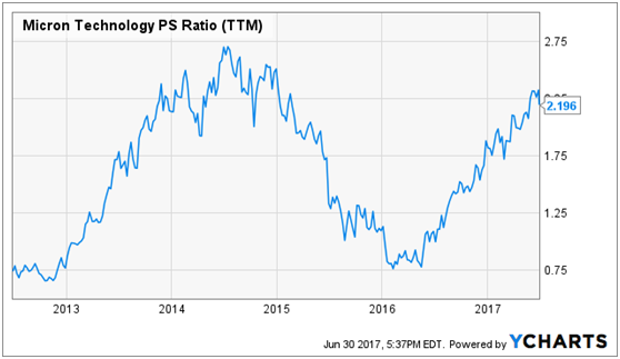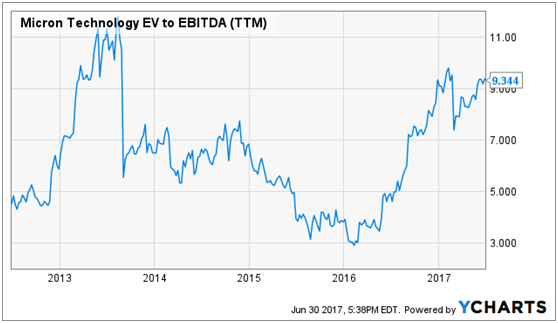 上一个周期,美光EPS在14年11月达到0.96,股价在35美元左右,如今,EPS,下个季度指引在1.9美元,而股价还不到30,公司动态市盈率(6x)显著低于行业平均(14.4x)。
