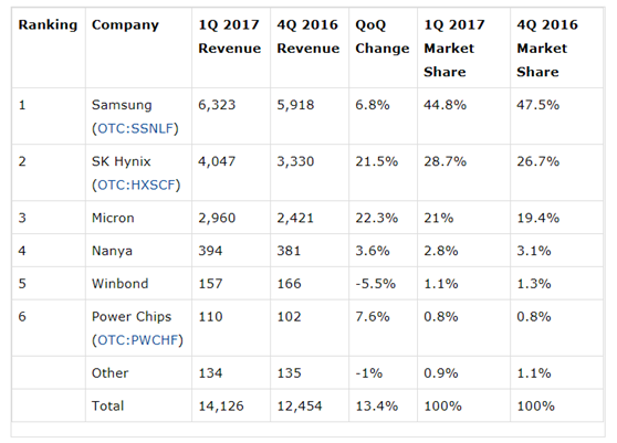 可以看出美光的份额在不断扩大,在手机DRAM市场更是明显: