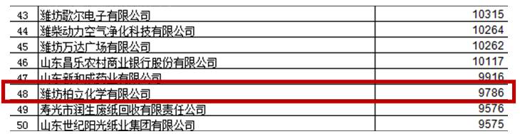 我们翻阅了纳税记录,发现2015年天德化工的子公司潍坊柏立化学在潍坊市纳税大户中排第48名,共计纳税9.8千万人民币。