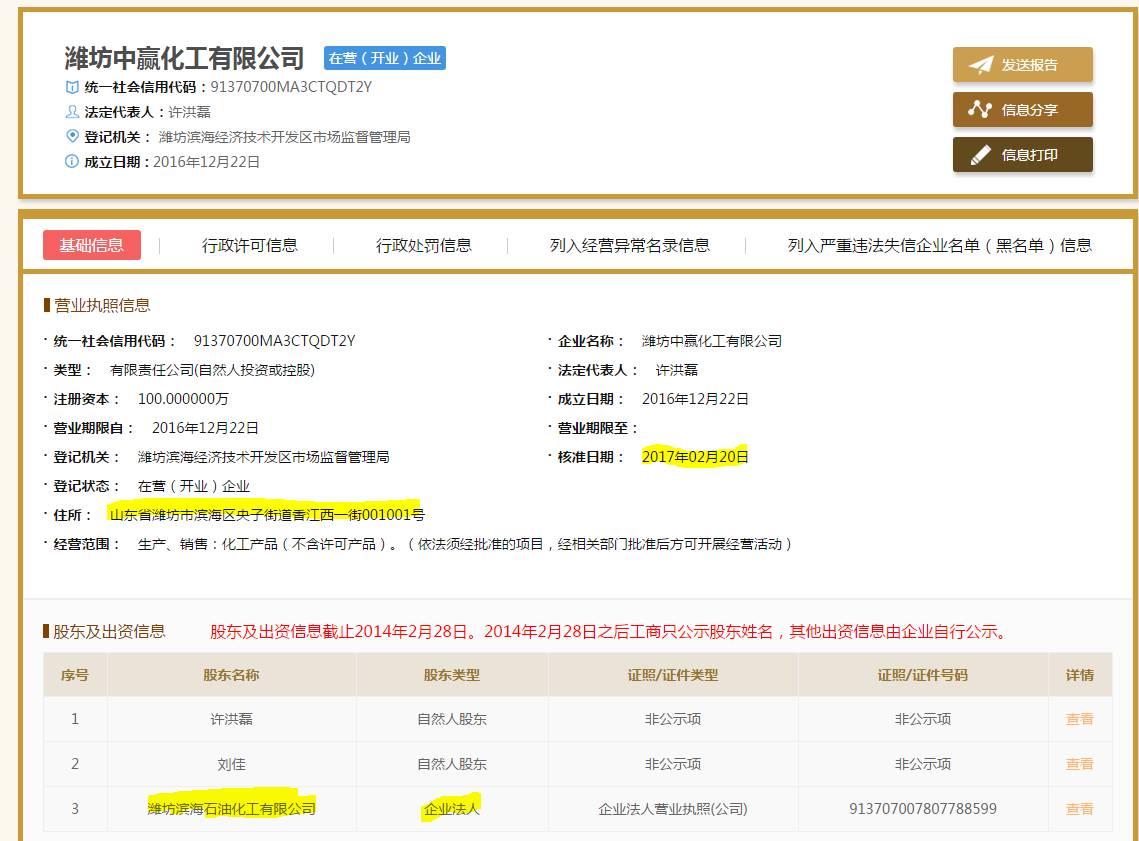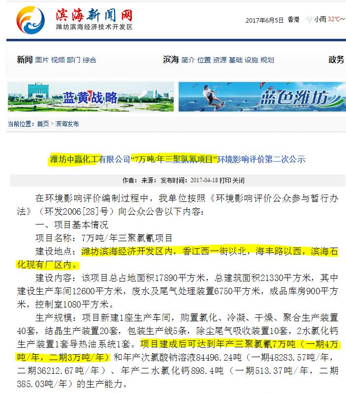 在另外一份环境影响评价公示中(由于公示仅1个月,目前公示已经删除,需由Google缓存网页进入),我们发现天德化工的新成立子公司潍坊中赢化工正在建设70,000吨产量的三聚氯氰项目。