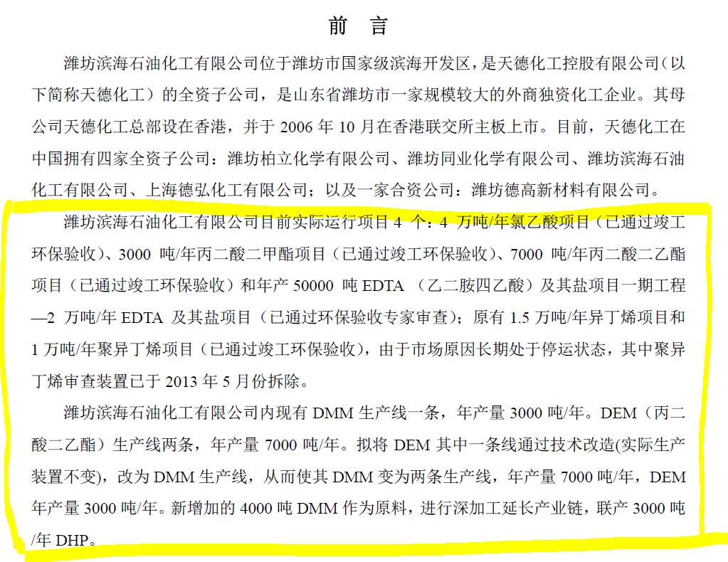 我们从潍坊滨海经济技术开发区的政府公开信息找到了这份年产3,000吨DHP、12,000吨甲醇钠项目的环境影响报告书。天德化工在子公司潍坊滨海石油化工中改造其目前的生产线,往下游发展生产DHP与甲醇钠。