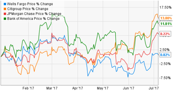 美国的四大银行:富国银行WFC,花旗集团C,美国银行BAC和摩根大通JPM。由于近期员工欺诈丑闻,截至目前,富国银行在今年的表现最差;但是由于其强大的商业模式和监管政策的松绑,很可能会带给投资者强劲的回报。