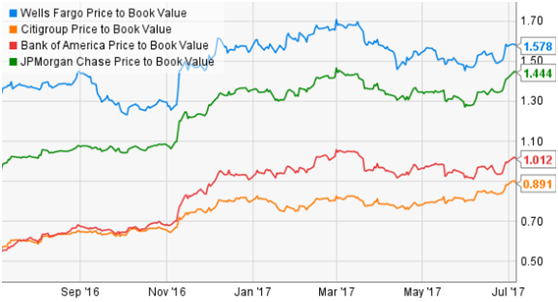 通过下图可以看出,富国银行的PB处于最高,摩根大通次之,第三为美国银行,花旗集团的PB最低。但是由于和其他几位相比,富国银行的业务有些单调,公司专注于抵押和财富管理,而不倾向于做投行业务和自营交易。简单的业务非常容易让人看懂,这也就是为什么巴菲特喜欢富国银行的关键,同样也是他在资产组合中配置相当一部分的重要因素。
