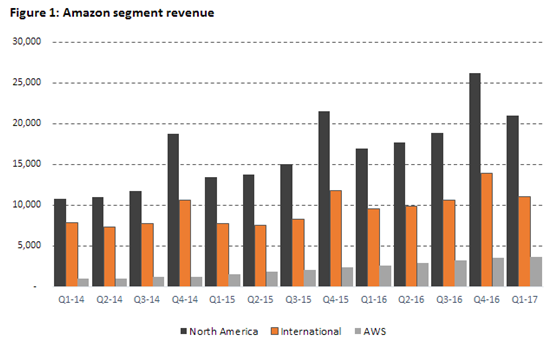 在上一个季度,北美的电商业务仍然是主要的营收来源,占到营收总比的59%,国际业务大约占30%,AWS占10%。