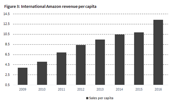 如果我们假设国际人口平均每人消费能在未来赶上美国的消费水平,那国际业务营收相当于有8090亿美元,而2016年,公司总营收才1300多亿美元,可想而知,为什么亚马逊要大力在国际业务上烧钱。